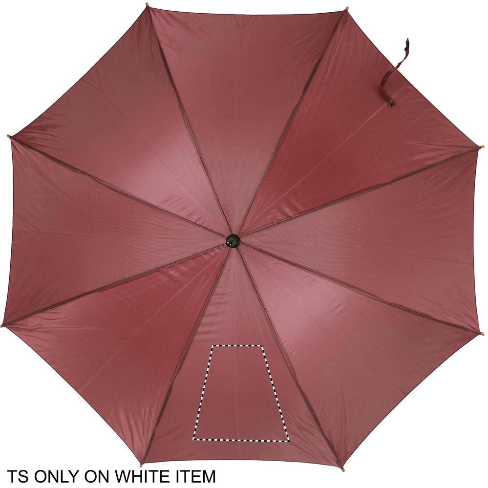 Paraplu, 23 inch. 190T polyester met houten steel, uiteinden en top. Zwart metalen baleinen. Houten handvat, natuurlijke uitstraling. Opent automatisch.