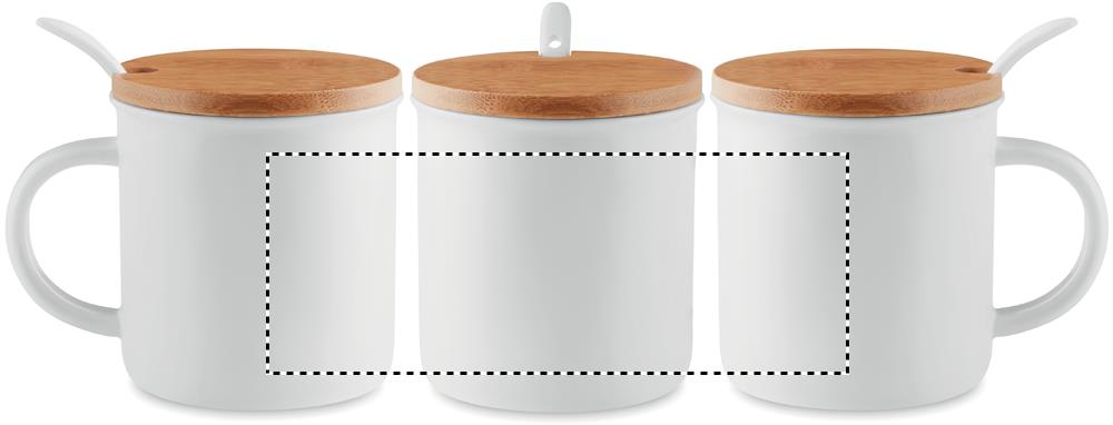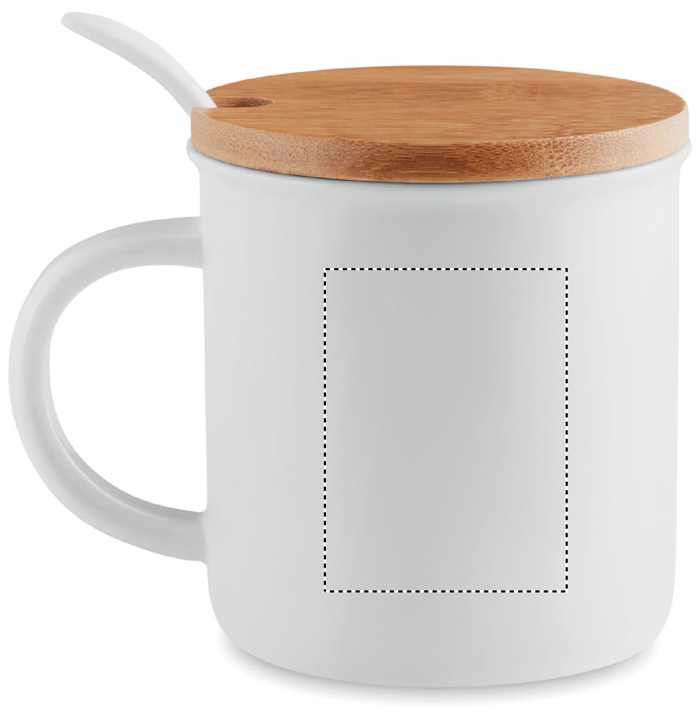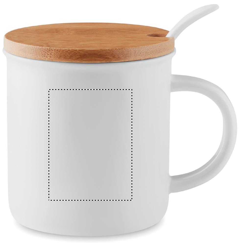 Porseleinen mok met lepel en bamboe deksel met een inhoud van 380 ml. Per stuk verpakt in doosje. Bamboe is een natuurlijk materiaal, waardoor de kleur per item kan verschillen.