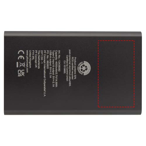 Laad de powerbank of je apparaat eenvoudig op via de Type-C in/uitgangspoort en/of gebruik de USB-A-poort om twee apparaten tegelijk op te laden. De powerbank is gemaakt van 25% RCS gecertificeerd gerecycled aluminium en heeft een 4000 mAh lithium-polymeerbatterij die een totaal uitgangsvermogen levert van max. 10 W. Inclusief een TPE Type-C naar USB-A-oplaadkabel.
