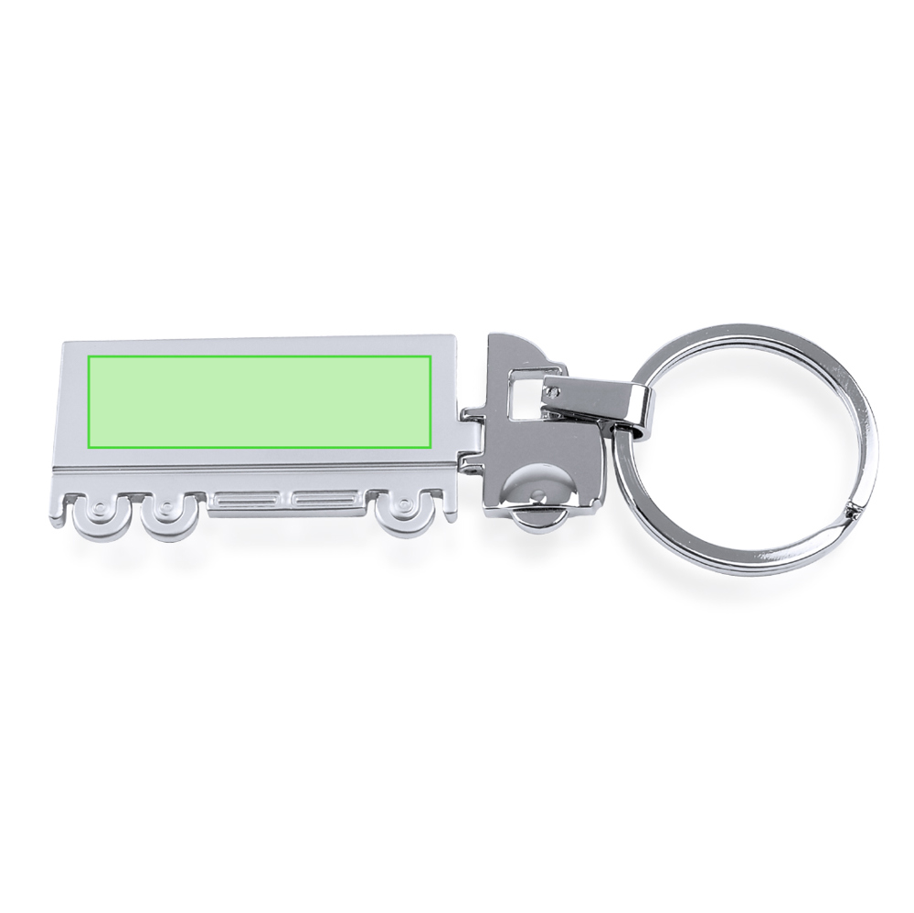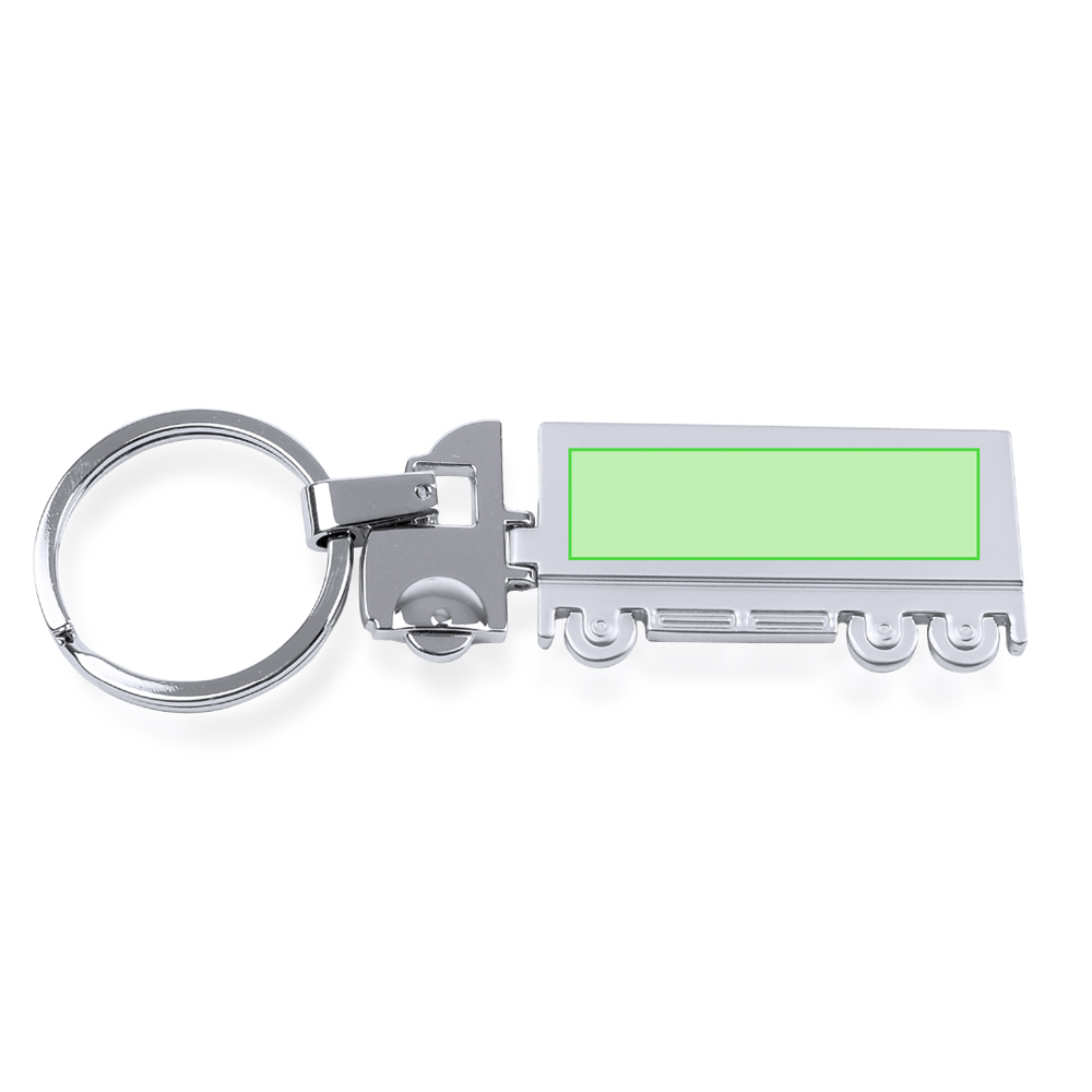 Metalen sleutelhanger in het ontwerp van een truck, speciaal ontworpen voor laserafdrukken. Met cabine in glanzende afwerking en aanhanger met matte afwerking.
