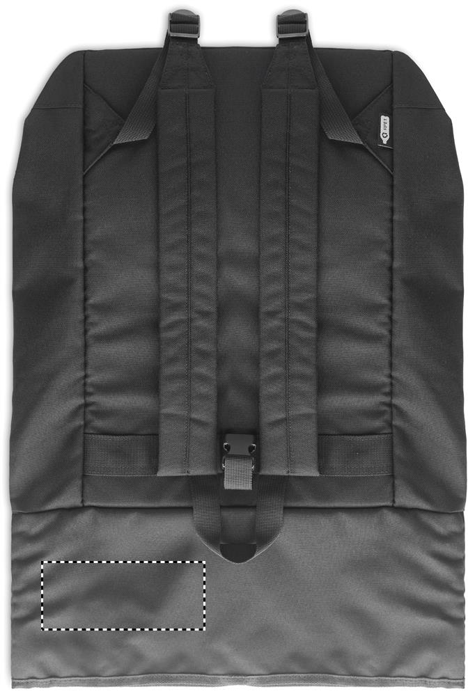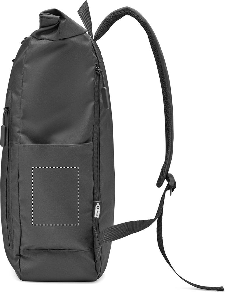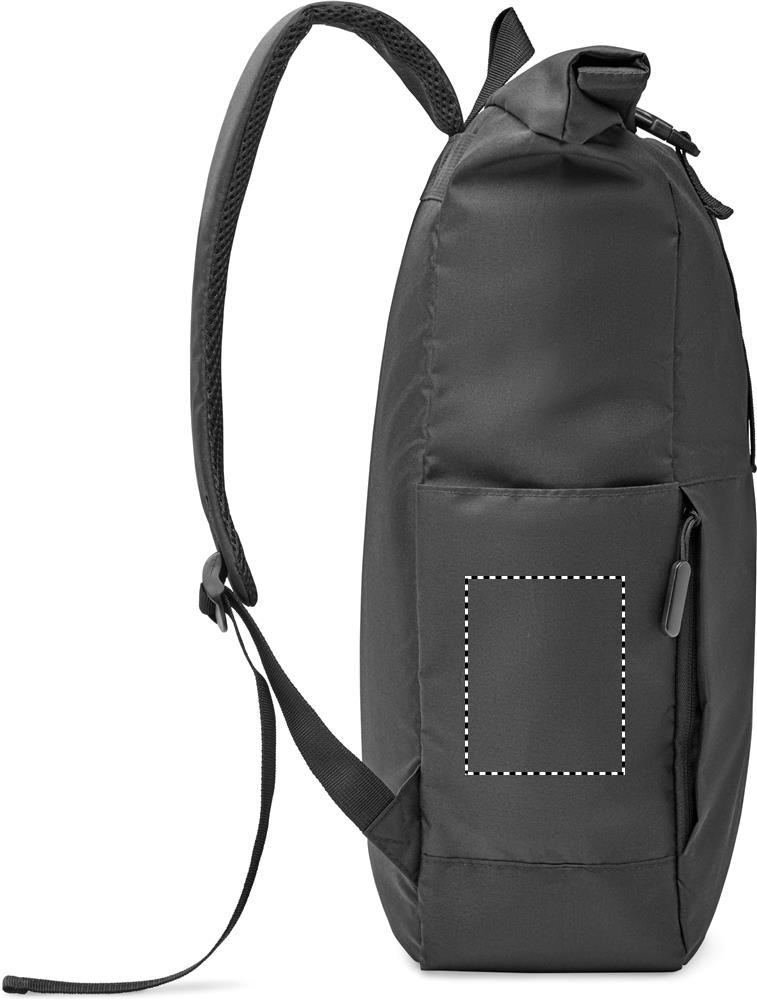 15 inch rolltop laptop rugzak van 300D RPET polyester. Groot voorvak met rits en klein verborgen vak met karabijnlus binnenin.